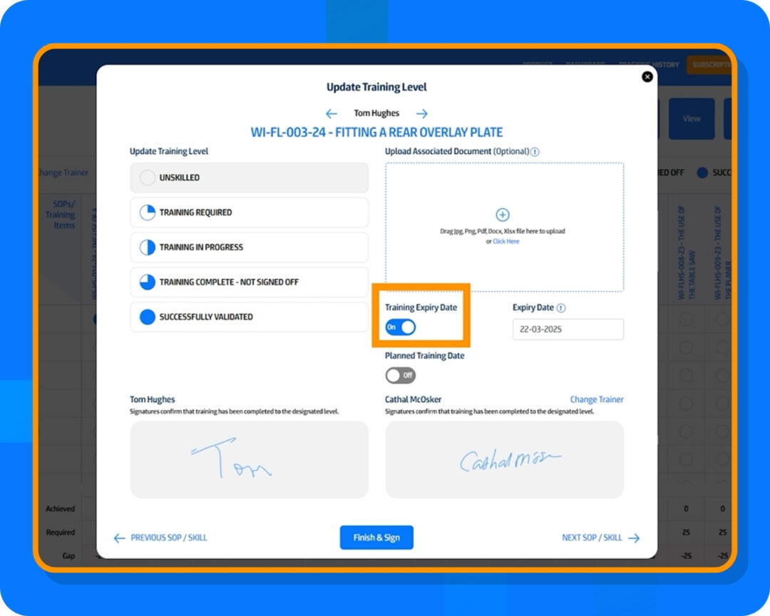 - Use the built-in skill levels or create your own (e.g. “Training Required,” “In Progress,” “Validated”)